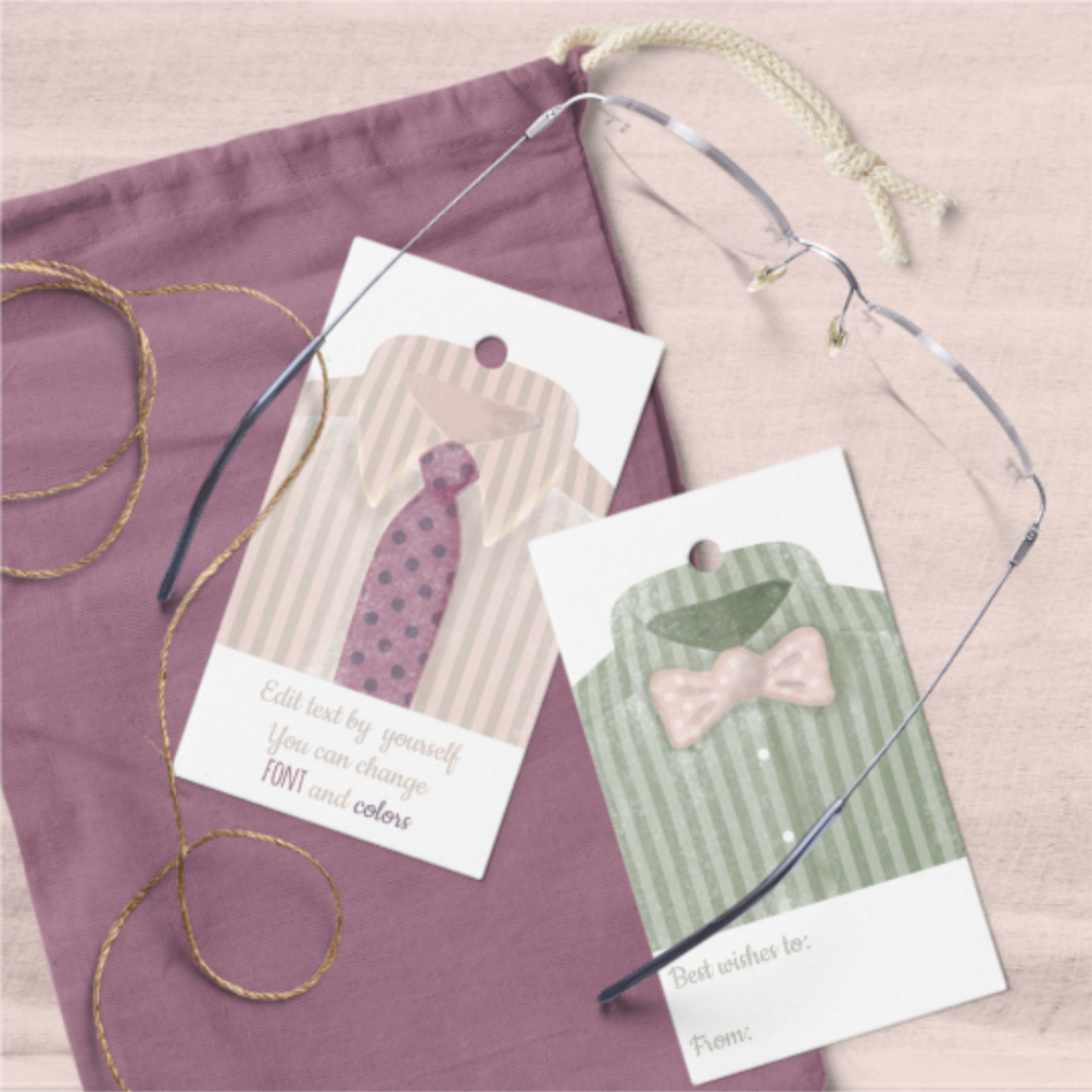 Printable and editable gift tags templates for him, with beige and green men's shirt illustrations.
