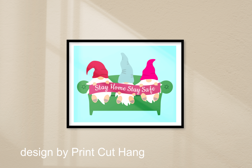 The Free ''Stay Home Stay Safe'' with gnomes sitting on a couch - printable poster as a little reminder of what we all have to do and what is the best now.