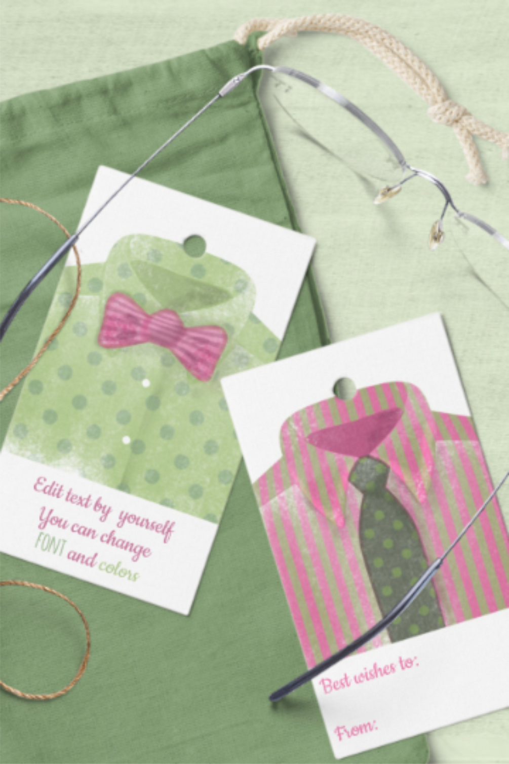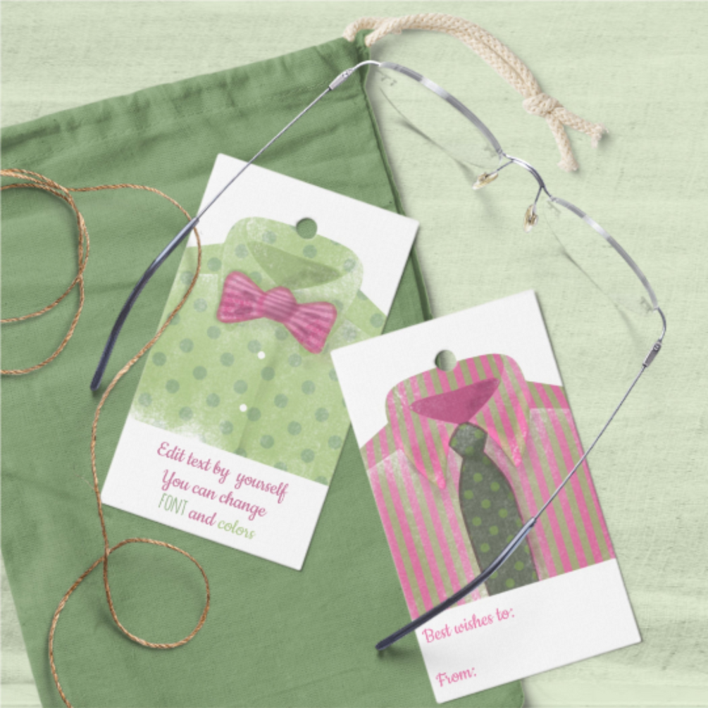 Green and pink watercolor gift tags, printable and editable tags templates with men's shirt illustrations, for Father's Day and men's birthdays.