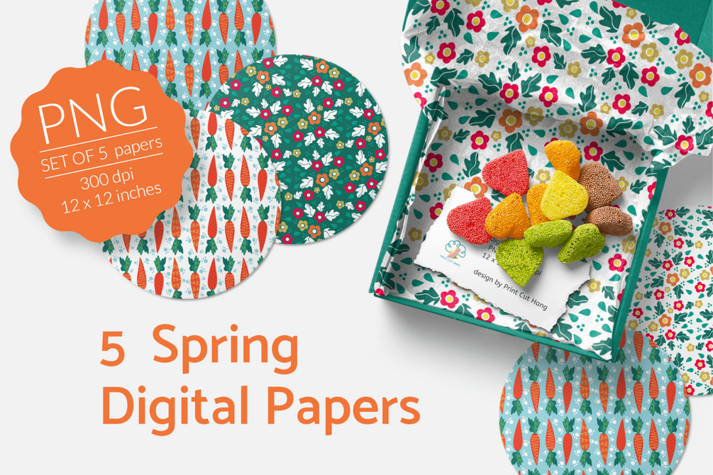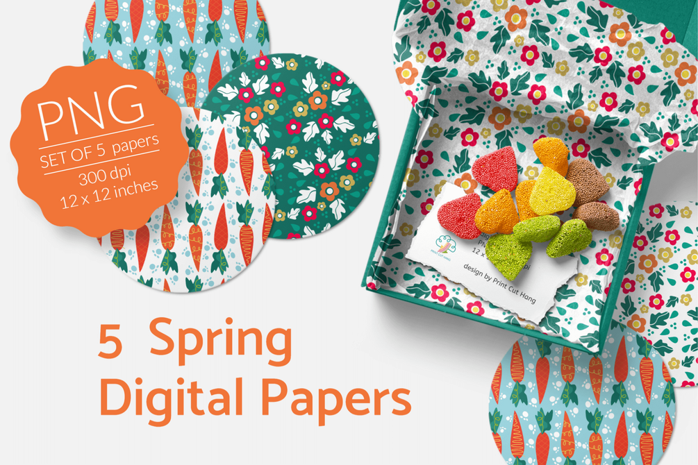 Spring Digital Papers with Carrots and Flowers Set of 5 PNG files